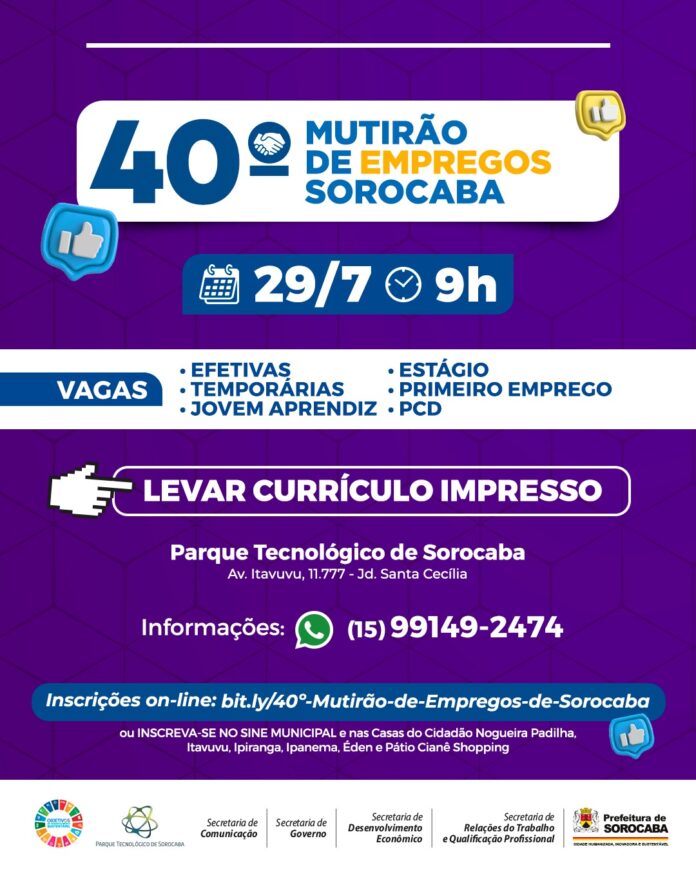As inscrições podem ser feitas pelo link: https://bit.ly/40º-Mutirão-de-Empregos-de-Sorocaba. Aos que preferirem, os agendamentos também podem ser realizados nas Casas do Cidadão Nogueira Padilha, Itavuvu, Ipiranga, Ipanema, Éden e Pátio Cianê Shopping.