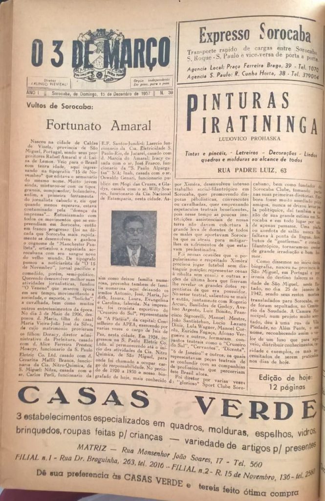 Fortunato Amaral, também conhecido como Ximera, foi editor e cronista da cidade, com olhar observador e atento do cotidiano, considerado um exemplo de coragem jornalística. Fundou o jornal “O Veneno”, que circulou em Sorocaba entre 1908 e 1913 como uma voz independente, crítica e provocadora. Em suas páginas estão décadas de história, política e cultura de forma divertida, mas sempre preservando o respeito e integridade dos envolvidos.