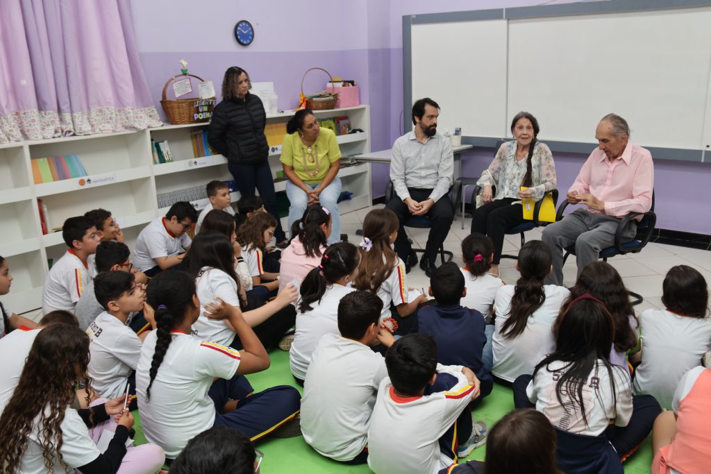 Os estudantes das turmas do 5º ano do período da manhã, representando todas as turmas dos 5ºs anos da E.M. “Quinzinho de Barros”, receberam uma visita ilustre e inspiradora nesta quarta-feira (17). Familiares do patrono dessa tradicional escola da rede municipal de ensino, localizada na Vila Hortência, na Zona Leste da cidade, atenderam ao chamado das professoras e da direção da escola e se reuniram aos estudantes, na Sala de Leitura, para falar um pouco sobre essa personalidade histórica de Sorocaba e de seu legado. Estiveram presentes uma das netas de Quinzinho, Isaura Hortência Prestes de Barros José dos Santos, seu marido Durval José dos Santos e seu filho, o dr. Durval do Carmo Barros Santos, bisneto de Quinzinho de Barros.