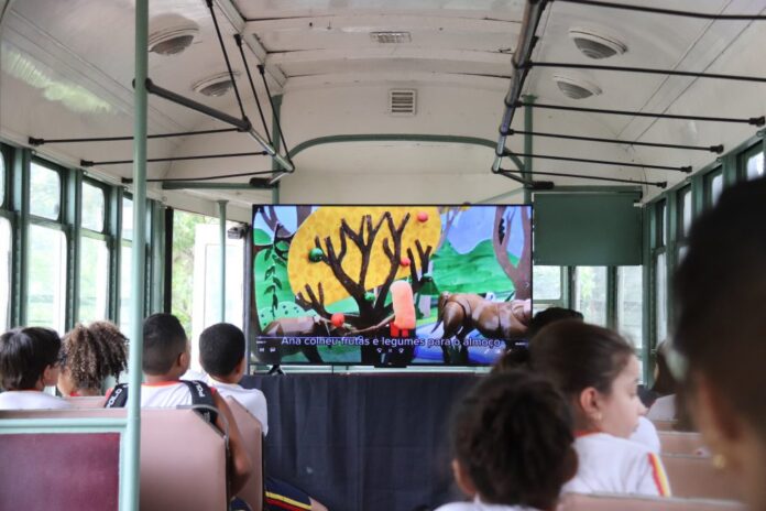 Alunos das turmas da manhã e da tarde da E.M. “Amin Cassar” e E.M. “Prof. Flávio de Souza Nogueira” visitaram o Museu Histórico Sorocabano, nesta quinta-feira (13), e puderam participar da Mostra de Animação do Sabe Tudo Conect@. A exibição dos vídeos, feitos a partir do tema Consumo Consciente em Movimento, foi realizada em um local muito especial, o vagão do Bonde exposto na parte externa do Museu, localizado no Zoológico Municipal “Quinzinho de Barros”, na Vila Hortência.