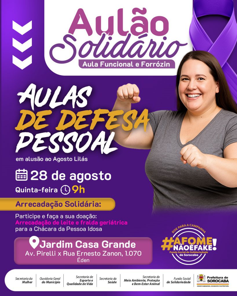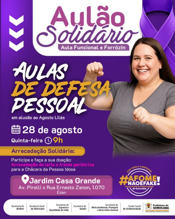 A Prefeitura de Sorocaba, por meio da Secretaria da Mulher (Semul) e do Fundo Social de Solidariedade (FSS), com a participação das Secretarias de Saúde (SES), Esporte e Qualidade de Vida (Sequav), Meio Ambiente, Proteção e Bem-Estar Animal (Sema) e Ouvidora do Município, realiza, nesta quinta-feira (28), às 9h, mais uma edição do “Aulão Solidário”, com aulas gratuitas de forró e de ginástica funcional. A atividade, que neste faz faz alusão ao Agosto Lilás, de combate à violência contra a mulher, terá aula de defesa pessoal e será na Avenida Pirelli com Rua Ernesto Zanon, 1.070, no Bairro Casa Grande, região do Éden.