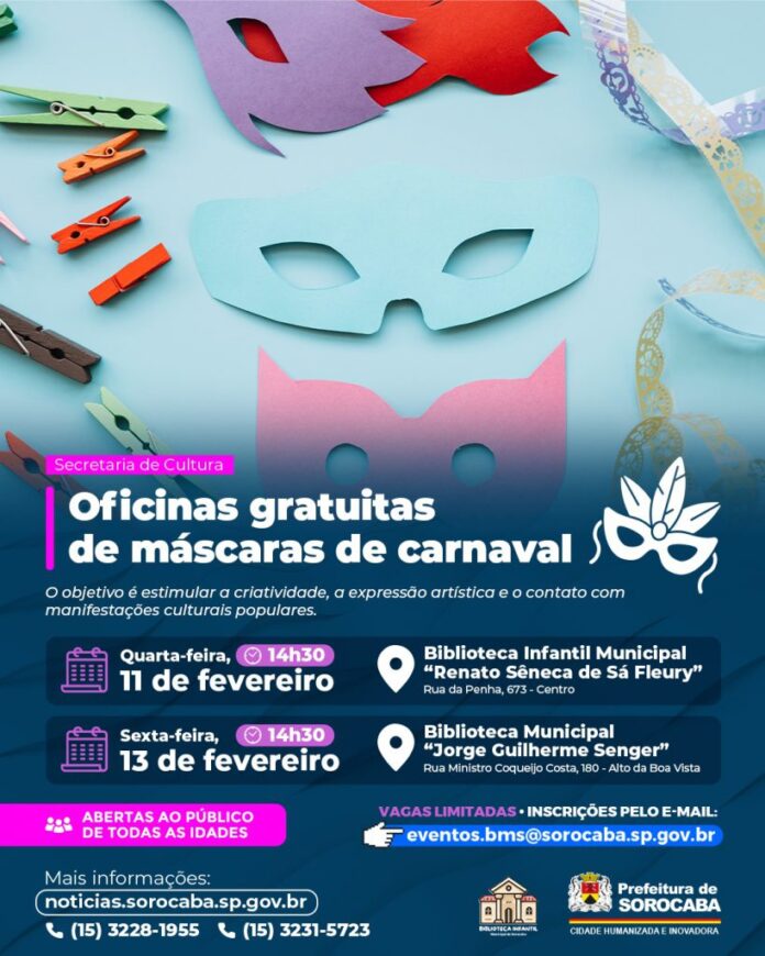 As famílias sorocabanas poderão participar, na próxima semana, das oficinas gratuitas de máscaras de carnaval nas Bibliotecas Municipais de Sorocaba. Na quarta-feira (11), às 14h30, a atividade ocorrerá na Biblioteca Infantil Municipal “Renato Sêneca de Sá Fleury”. Já na sexta-feira (13), também às 14h30, a programação será levada à Biblioteca Municipal “Jorge Guilherme Senger”.