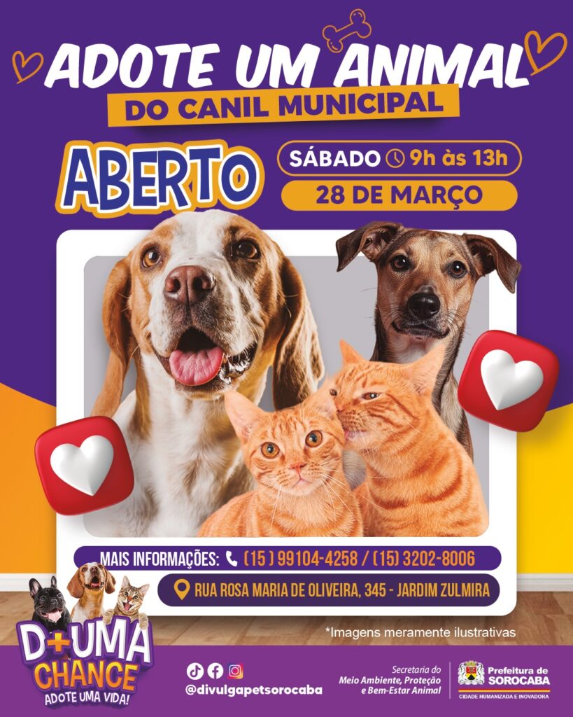 A Prefeitura de Sorocaba, por meio da Secretaria do Meio Ambiente, Proteção e Bem-Estar Animal (Sema), abrirá, no dia 28 de março, sábado, das 9h às 13h, o Canil Municipal. Neste dia, as famílias terão a oportunidade de conhecer os animais resgatados pela Seção de Proteção e Bem-Estar Animal, entre cães e gatos, em sua grande maioria vítimas de maus-tratos, que estão a espera de um novo lar.