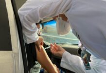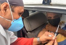 A imunização ocorre em horários pré-determinados, em seis pontos de drive-thru espalhados pela cidade