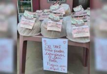 Se você não puder comprar o seu bolo, pegue um aqui. A frase está escrita em um pedaço de papel fixado em uma mesa...