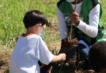 Crianças e adultos plantam 300 árvores em área de proteção ambiental para celebrar o...
