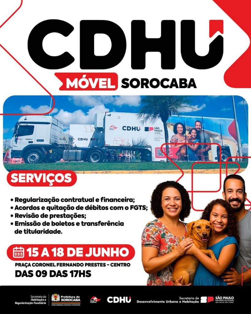 Sorocaba recebe nesta semana, de terça (15) a sexta-feira (18), a unidade móvel da Companhia de Desenvolvimento Habitacional e Urbano (CDHU), para atendimento à população com serviços habitacionais. A carreta ficará estacionada na Praça Coronel Fernandes Prestes, no Centro, das 9h às 17h.
