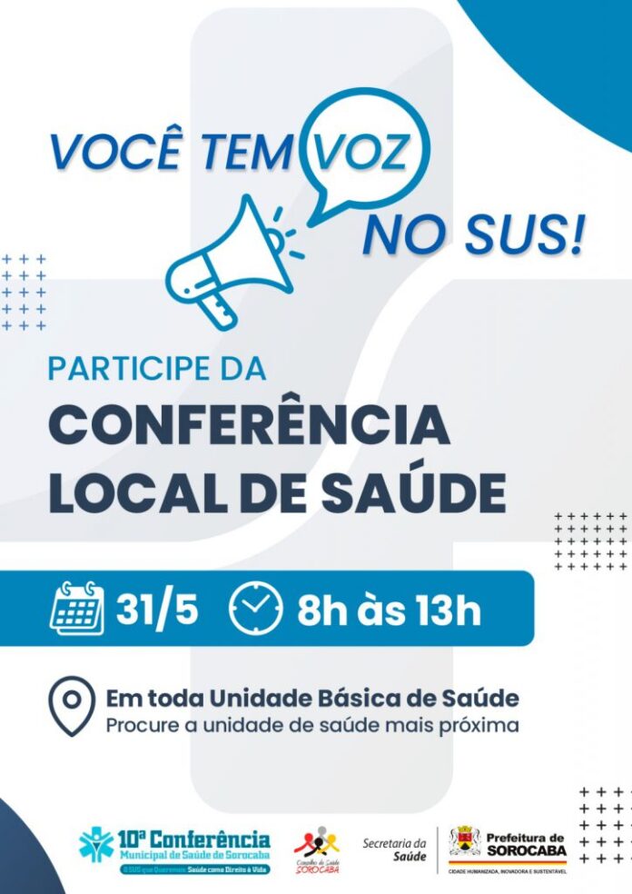 O Conselho Municipal da Saúde de Sorocaba, com apoio da Prefeitura de Sorocaba, por meio da Secretaria da Saúde (SES), realizará, no dia 31/5, das 8h às 13h, as Conferências Locais de Saúde nas 33 Unidades Básicas de Saúde (UBSs) da cidade, que são preparatórias para a 10ª Conferência Municipal de Saúde de Sorocaba.
