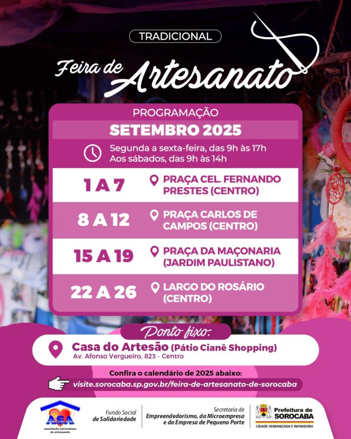 A programação da Feira do Artesanato de setembro tem início na segunda-feira (1º), na Praça Cel. Fernando Prestes (Centro) e segue até o dia 7 de setembro. Entre os dias 8 e 12 de setembro, os artesãos seguem para a Praça Carlos de Campos (Centro). De 15 a 19 de setembro, a Feira do Artesanato acontecerá na Praça da Maçonaria (Jardim Paulistano). Por fim, de 22 a 26 de setembro, a Feira do Artesanato passa a acontecer no Largo do Rosário (Centro). O horário de funcionamento é sempre das 9h às 17h, de segunda a sexta-feira, e das 9h às 14h, aos sábados.