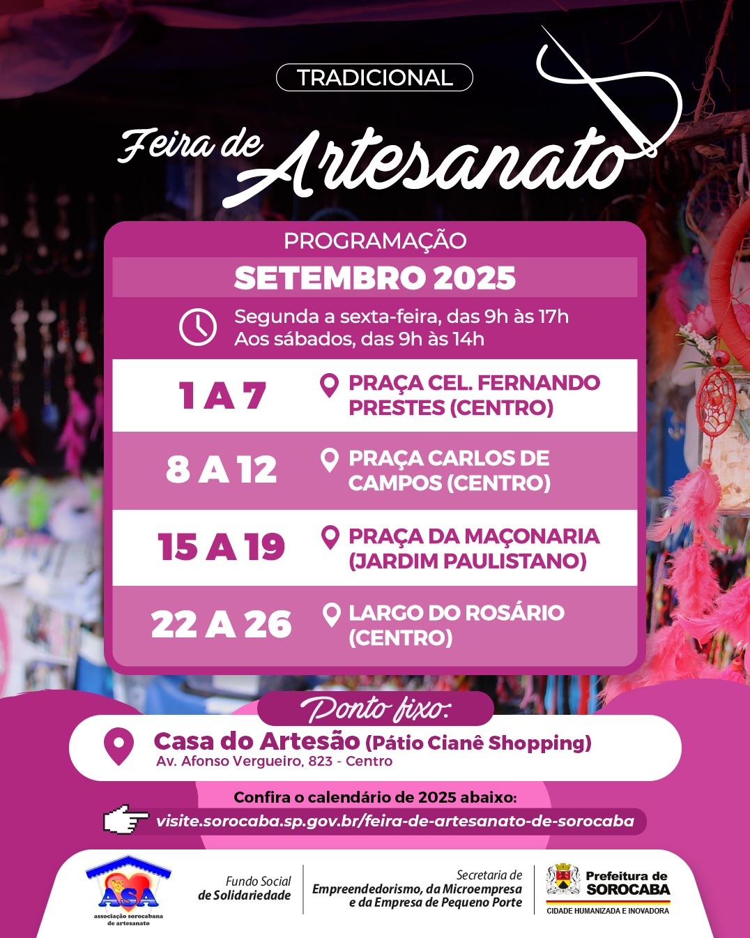 A Prefeitura de Sorocaba, por meio da Secretaria de Empreendedorismo, da Microempresa e da Empresa de Pequeno Porte (Semepp), em parceria com o Fundo Social de Solidariedade (FSS) e a Associação Sorocabana de Artesanato (ASA), divulga o calendário de setembro da tradicional Feira de Artesanato na cidade.