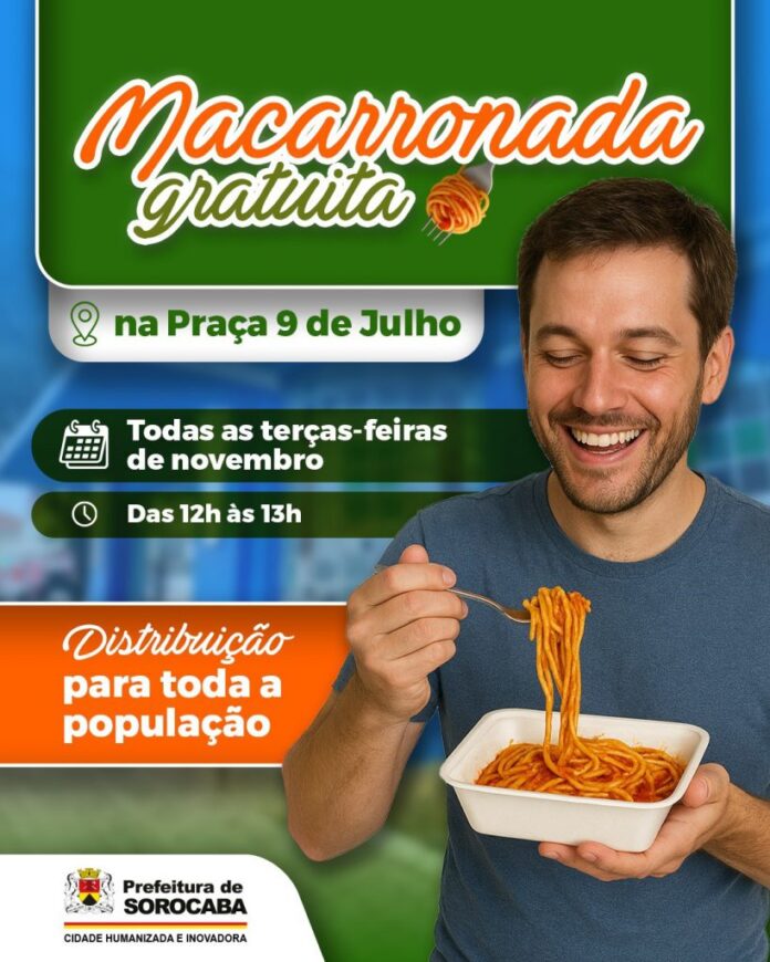 A Prefeitura de Sorocaba distribuirá, gratuitamente, macarrão para toda a população, na Praça 9 de Julho, das 12h às 13h, nos dias 4, 11, 18 e 25 de novembro (às terças-feiras).
