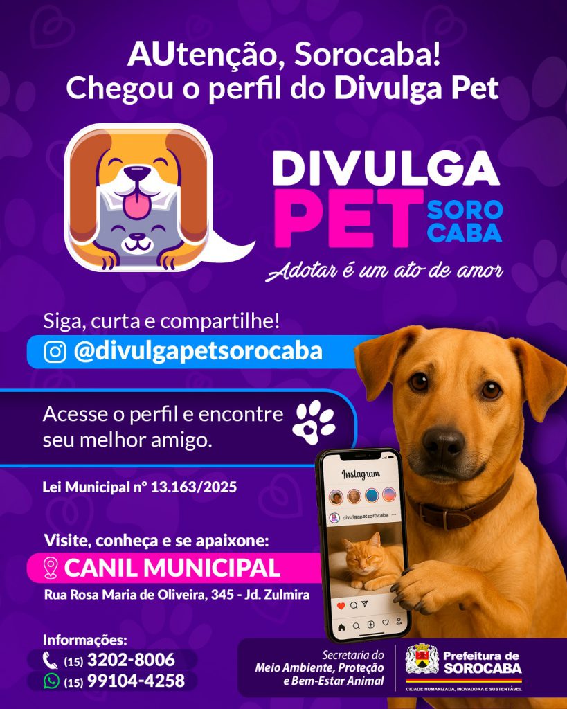 Viabilizada pela Lei Municipal nº 13.163/2025, da vereadora Jussara Fernandes, a iniciativa da Secretaria do Meio Ambiente, Proteção e Bem-Estar Animal (Sema) utilizará os canais oficiais da Prefeitura, como site, redes sociais e demais meios de comunicação, para dar visibilidade a cães e gatos que estão sob tutela do Canil Municipal de Sorocaba e, com isso, ampliar as chances de adoção.