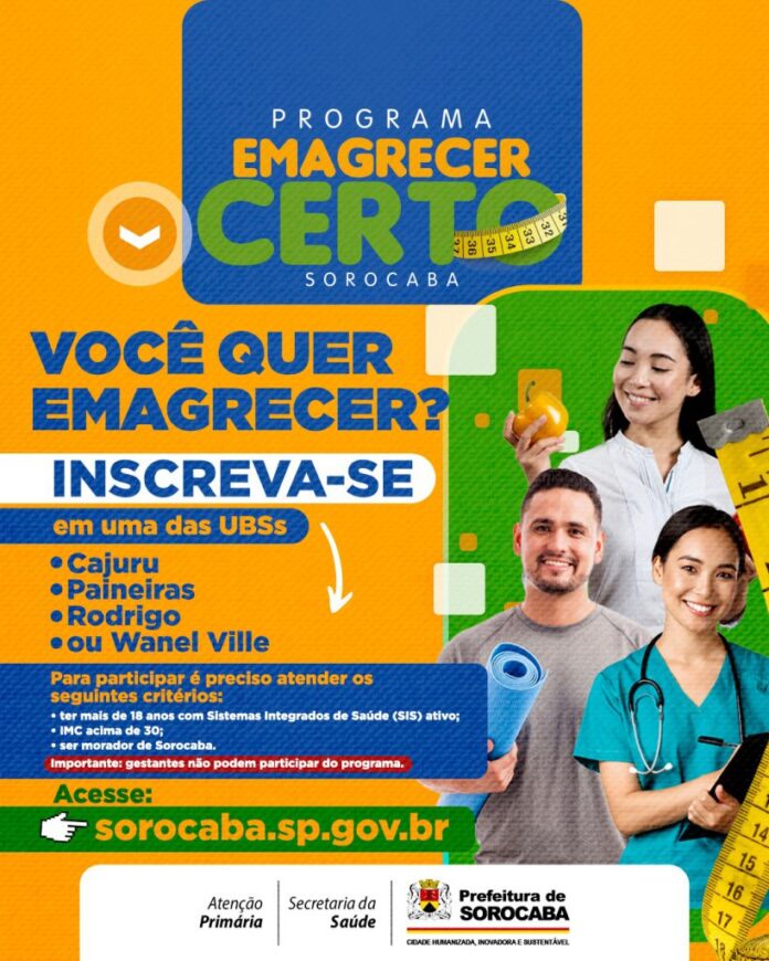 Dando sequência ao programa “Emagrecer Certo Sorocaba”, Prefeitura, por meio da Secretaria da Saúde (SES), abre, nesta terça-feira (15), inscrição para 160 novos participantes. As UBSs participantes serão as unidades: Cajuru, Paineiras, Rodrigo e Wanel Ville.