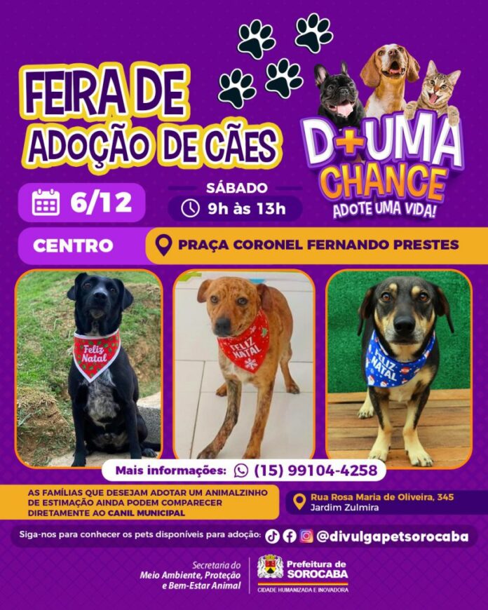 A Praça Coronel Fernando Prestes, no Centro de Sorocaba, vai receber neste sábado (6), das 9h às 13h, o evento de adoção de cães do Canil Municipal. A realização é da Prefeitura de Sorocaba, por meio da Secretaria do Meio Ambiente, Proteção e Bem-Estar Animal (Sema).