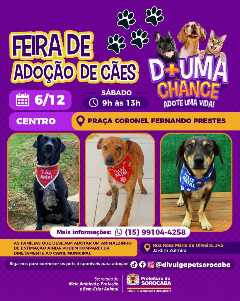 Realizada durante o ano todo e em locais diferentes da cidade, a campanha municipal do programa “D + uma chance, adote uma vida!” é um incentivo a adoção dos animais tutelados pelo Canil Municipal. Todos os cães disponíveis são vacinados, castrados e microchipados.