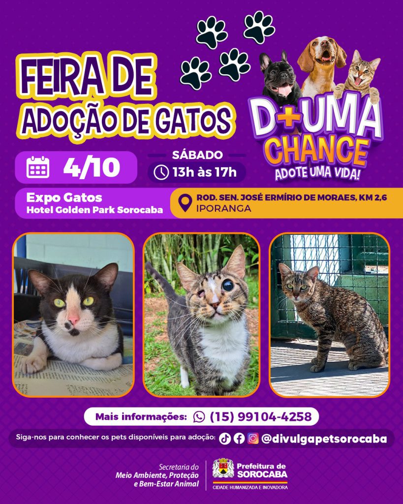 A Expo Gatos acontecerá, neste fim de semana (4 e 5), das 10h às 17h, no Hotel Golden Park Sorocaba (Rodovia Senador José Ermírio de Moraes, km 2,6 – Iporanga). O evento é beneficente, com entrada gratuita, e contará com diversas atrações, além da feira de adoção dos gatinhos tutelados pelo Canil Municipal de Sorocaba, gerido pela Prefeitura de Sorocaba, por meio da Secretaria do Meio Ambiente, Proteção e Bem-Estar Animal (Sema).