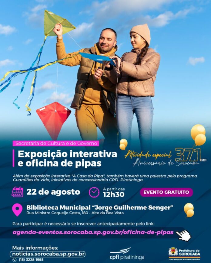 As famílias sorocabanas terão a oportunidade de participar, no dia 22 de agosto, a partir das 12h30, da oficina gratuita de confecção de pipas, na Biblioteca Municipal “Jorge Guilherme Senger”, localizada no Alto da Boa Vista. No local, também terá a exposição interativa “A Casa da Pipa”, além de uma palestra pelo programa Guardiões da Vida, iniciativas da concessionária CPFL Piratininga.