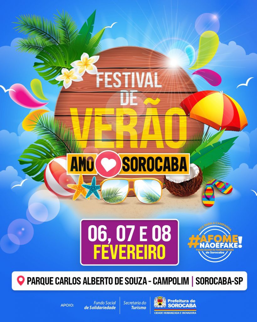 As famílias sorocabanas terão a oportunidade de participar, de sexta a domingo (6 a 8), do “Festival de Verão – Amo Sorocaba”, no Parque “Carlos Alberto de Souza”, no Parque Campolim. Com entrada gratuita, o evento contará com uma grande variedade gastronômica, além de shows, apresentações culturais e feira com empreendedores criativos.