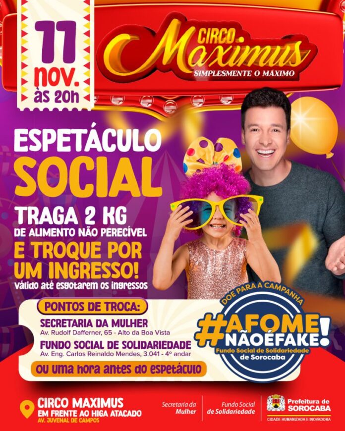 A Prefeitura de Sorocaba, por meio do Fundo Social de Solidariedade (FSS) e da Secretaria da Mulher (Semul), está realizando uma campanha social, em parceria com o Circo Maximus, para a doação de alimentos não perecíveis destinados à campanha permanente “A Fome não é Fake!”. Toda a alimentação arrecada será posteriormente entregue a famílias em vulnerabilidade social de Sorocaba.