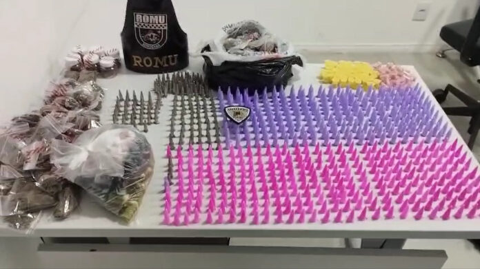 Com o maior de idade havia, 87 porções de maconha, 13 de crack, 28 de cocaína e 30 de metanfetamina. Por sua vez, de posse do adolescente foram recolhidas 65 porções de maconha, 116 de crack, 114 de skank e 670 de cocaína.