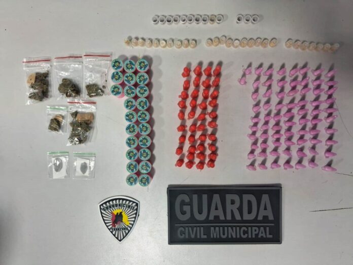 Os guardas avistaram dois suspeitos nas imediações que, ao perceberem a aproximação da viatura, fugiram, tomando rumo ignorado. A equipe fez varredura no local e encontrou a bolsa. Nela havia 111 porções de cocaína, 28 de maconha, 27 de crack, 13 de haxixe e duas de LSD. Também foi apreendido R$ 1,10 em moedas.