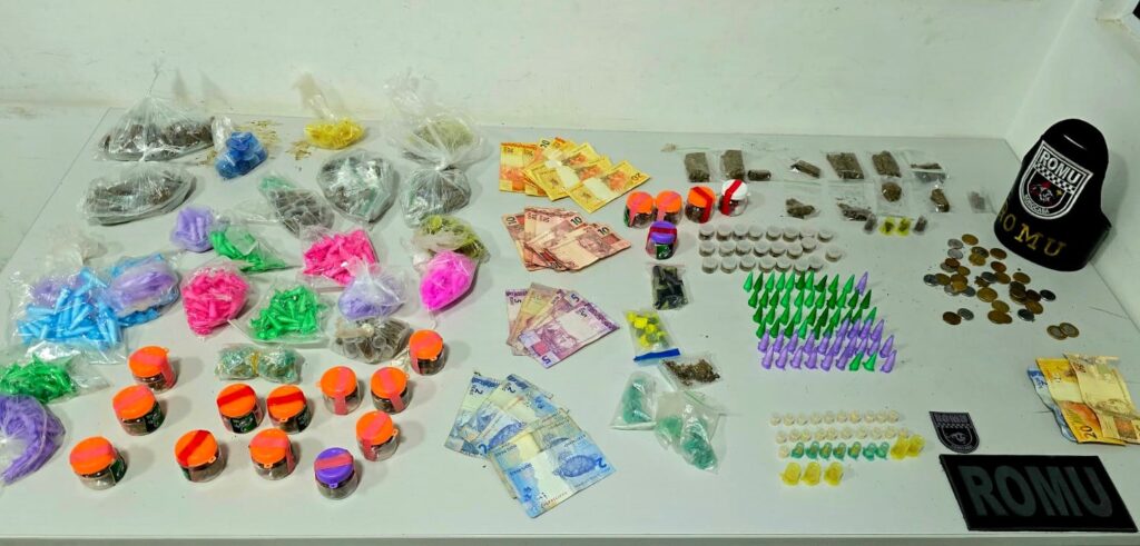 Ao perceberem a aproximação da viatura, os suspeitos tentaram fugir, sendo abordados pela guarnição. Com um deles havia porções de cocaína, crack e maconha, além de R$ 277 em dinheiro. Com o segundo, que portava uma sacola, foram encontradas também porções das mesmas substâncias entorpecentes e R$ 85,60.