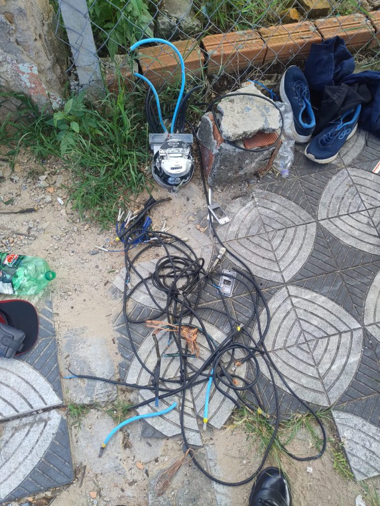 A equipe se deslocou até o local e realizou a abordagem de dois homens que correspondiam às características informadas. Durante a busca pessoal, foram encontrados dois medidores de energia elétrica, sendo um analógico e outro digital, além de fios e outros objetos.