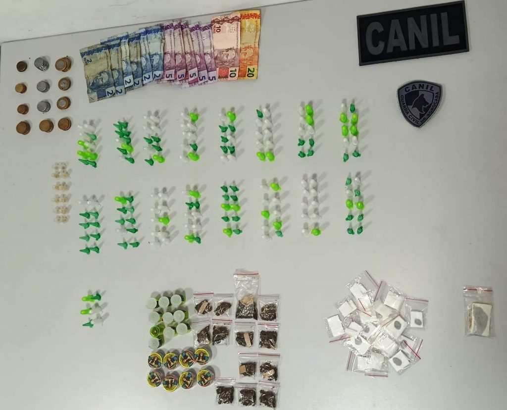 O hopmem estava com uma mochila, onde foram encontradas 166 porções de cocaína, 31 de maconha, 24 de haxixe, 12 de crack e uma de droga não identificada.