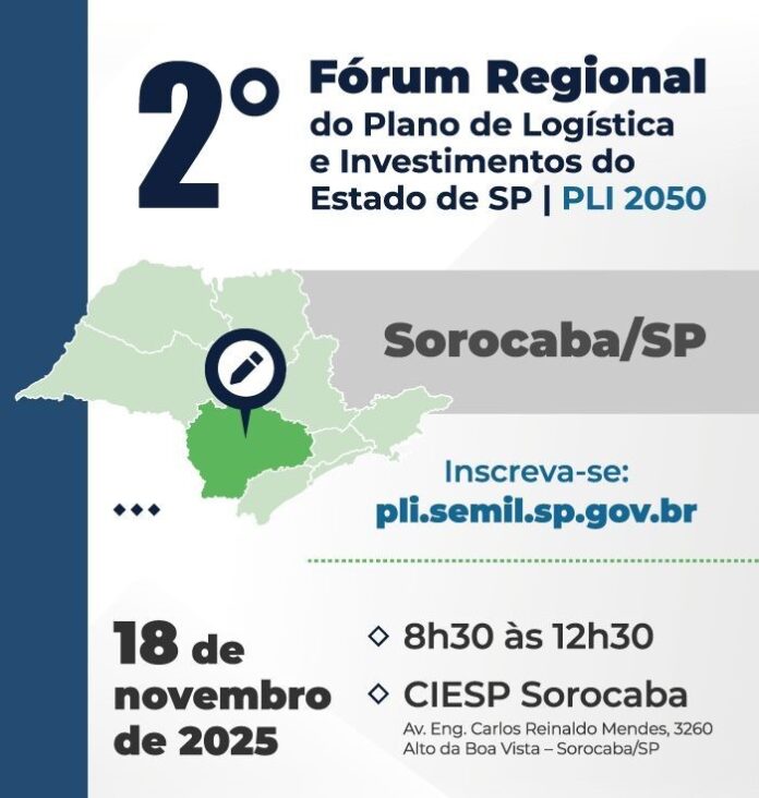O Governo de São Paulo, por meio da Secretaria de Meio Ambiente, Infraestrutura e Logística (Semil) e da Subsecretaria de Logística e Transportes (SLT), com o apoio da Prefeitura de Sorocaba, promove, na próxima terça-feira (18), das 8h30 às 12h30, no Ciesp Sorocaba, o 2º Fórum Regional do Plano de Logística e Investimentos – PLI-SP 2050. As vagas são limitadas e as inscrições já podem ser feitas pelo link: https://pli.semil.sp.gov.br.