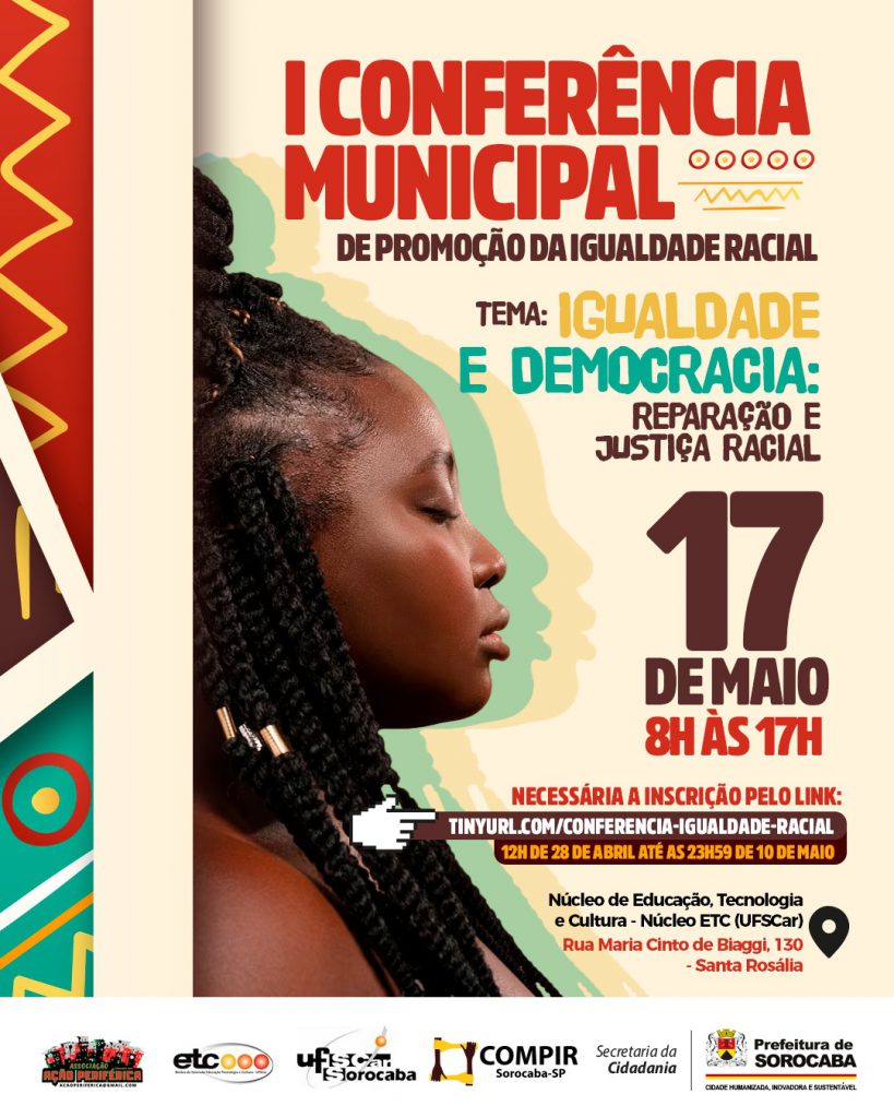 Sorocaba terá, no dia 17 de maio, das 8h às 17h, a 1ª Conferência Municipal de Promoção da Igualdade Racial, no Núcleo de Educação, Tecnologia e Cultura da UFSCar (Universidade Federal de São Carlos). As vagas são limitadas e, por isso, é necessário se inscrever a partir de 12h da próxima segunda-feira (28), pelo link: https://tinyurl.com/conferencia-igualdade-racial.