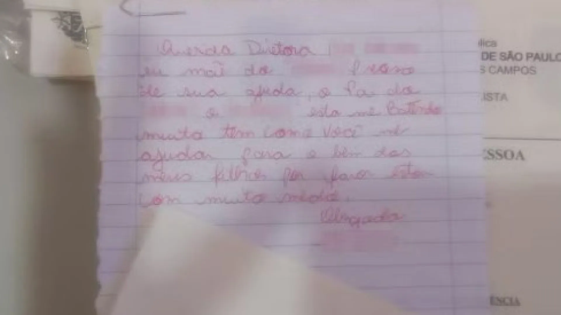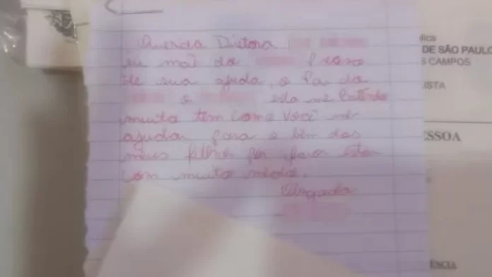 “Querida diretora, preciso de sua ajuda. O pai do meu filho está me batendo muito. Tem como você me ajudar? Para o bem dos meus filhos, por favor. Estou com muito medo. Obrigada.”