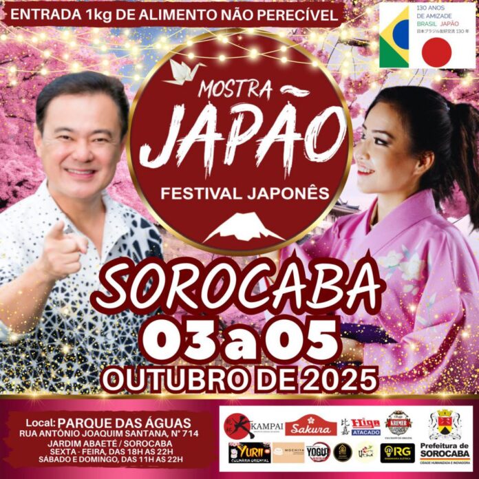 As famílias sorocabanas estão convidadas a participar, de sexta a domingo (3 a 5 de outubro), da Mostra Japão, no Parque das Águas, localizado no Jardim Abaeté. O evento ocorrerá nesta sexta-feira (3), das 18h às 22h, e no sábado e domingo (4 e 5), das 11h às 22h.