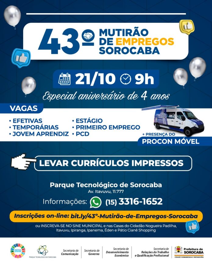 O Mutirão de Empregos Sorocaba – Edição especial de aniversário de 4 anos, que acontecerá no dia 21 de outubro, às 9h, no Parque Tecnológico de Sorocaba (PTS), reunirá milhares de vagas de empregos, com diversas empresas e instituições recebendo currículos e entrevistando candidatos no local. Ainda, serão oferecidas palestras gratuitas com renomados profissionais.