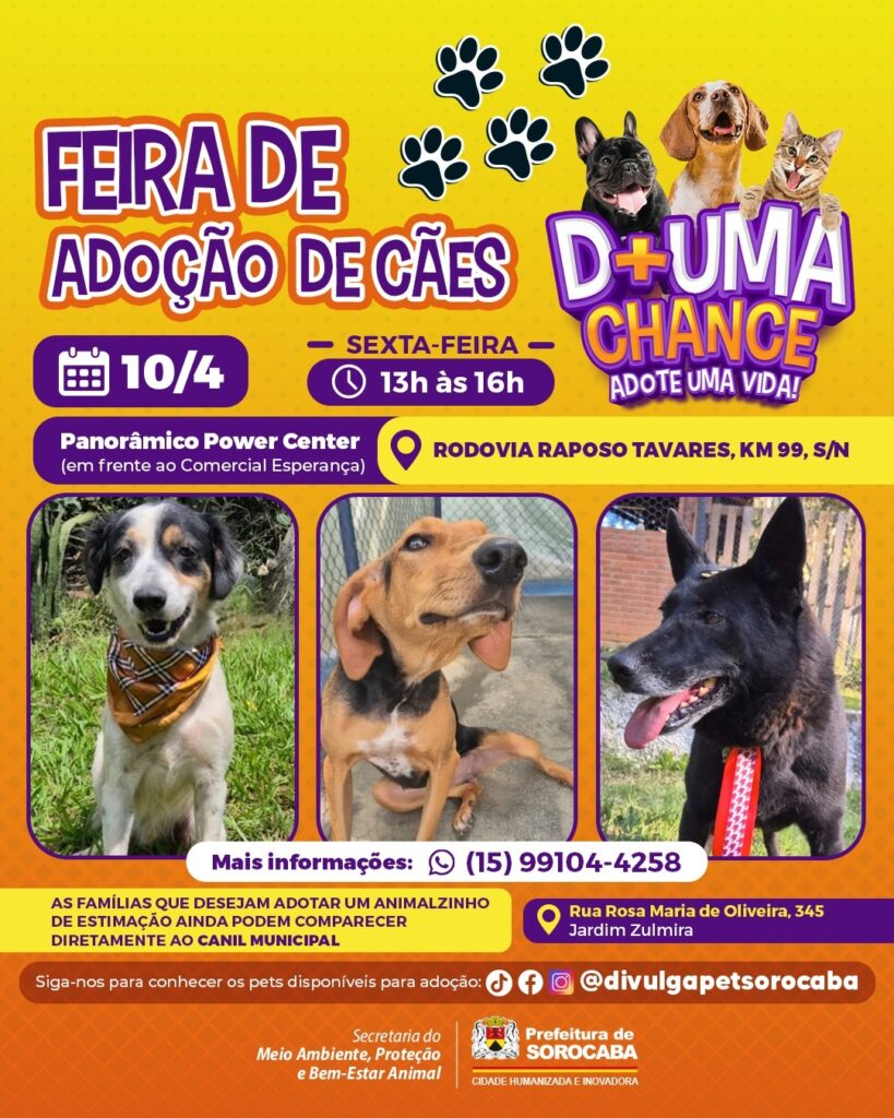 A Prefeitura de Sorocaba, por meio da Secretaria do Meio Ambiente, Proteção e Bem-Estar Animal (Sema), realizará, nesta sexta-feira (10), das 13h às 16h, a feirinha de adoção de cães do Canil Municipal no Panorâmico Power Center, em frente ao Comercial Esperança, na Rodovia Raposo Tavares, Km 99, s/n.