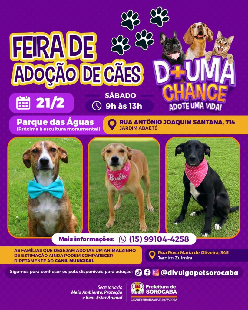 A Prefeitura de Sorocaba, por meio da Secretaria do Meio Ambiente, Proteção e Bem-Estar Animal (Sema), realizará neste sábado (21), das 9h às 13h, a feirinha de adoção de cães no Parque das Águas, localizado no Jardim Abaeté, próxima à escultura monumental.