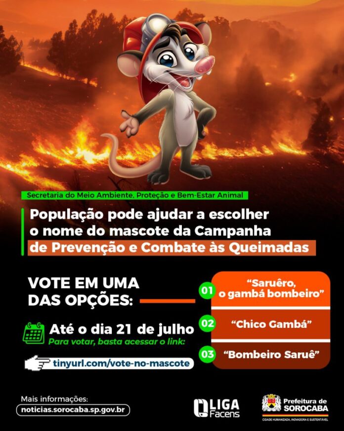 As três opções de nomes escolhidos pela Sema são: “Saruêro, o gambá bombeiro”, “Chico Gambá” e “Bombeiro Saruê”. A divulgação do nome mais votado ocorrerá no dia 2 de agosto, na Praça Coronel Fernando Prestes, durante a programação de encerramento da Campanha de Prevenção e Combate às Queimadas 2025, que tem como tema “Apagar o Fogo é Preservar”, e também nas redes sociais da Prefeitura de Sorocaba.