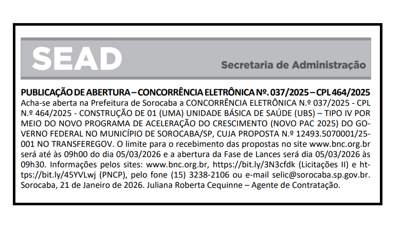 A Prefeitura de Sorocaba publicou, nesta quinta-feira (21), no Jornal do Município, a abertura de Concorrência Eletrônica nº 37/2025, que trata da construção da nova Unidade Básica de Saúde (UBS) Horto Florestal, próxima à região do Parque São Bento, na Zona Norte da cidade. A previsão é que a ordem de início da obra ocorra até maio de 2026, com conclusão em até 14 meses de execução. A publicação pode ser acessada no link: https://noticias.sorocaba.sp.gov.br/wp-content/uploads/2026/01/noticias.sorocaba.sp.gov.br-3878-21-de-janeiro-de-2026-reserva.pdf.
