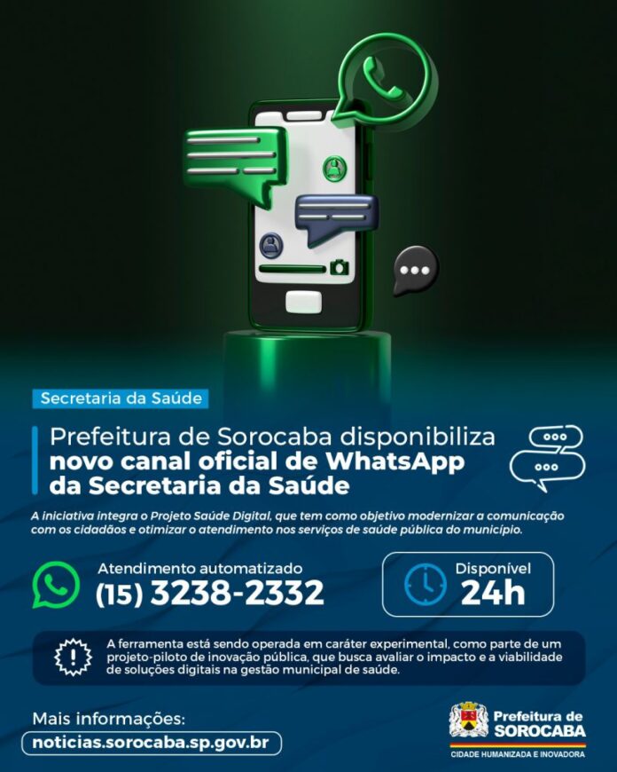 A Prefeitura de Sorocaba, por meio da Secretaria da Saúde (SES), iniciou, na última semana, em caráter de testes o novo canal oficial de WhatsApp da Saúde, disponível 24 horas, pelo número (15) 3238-2332. A iniciativa integra o Projeto Saúde Digital, que tem como objetivo modernizar a comunicação com os cidadãos e otimizar o atendimento nos serviços de saúde pública do município.