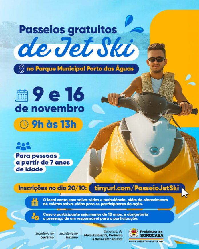 A Prefeitura de Sorocaba, por meio das Secretarias de Governo (Segov), do Turismo (Setur) e do Meio Ambiente, Proteção e Bem-Estar Animal (Sema), oferece passeios de jet ski no Parque Municipal Porto das Águas. Eles são gratuitos e acontecem nos dias 9 e 16 de novembro, das 9h às 13h. As inscrições estão abertas pelo link: https://agenda-eventos.sorocaba.sp.gov.br/passeio-de-jet-ski/.