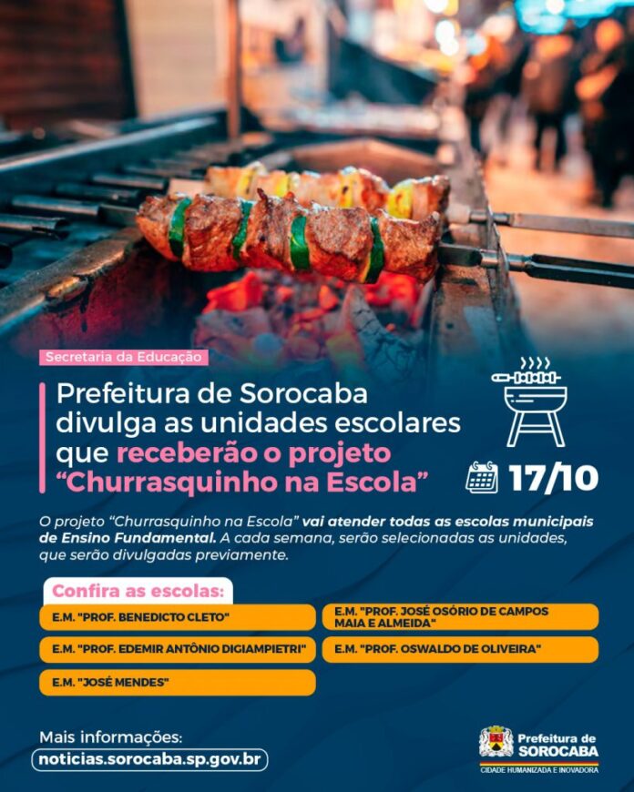 A Prefeitura de Sorocaba, por meio da Secretaria da Educação (Sedu), passou a oferecer o projeto “Churrasquinho na Escola”. Nesta sexta-feira (17), mais alunos de escolas municipais da cidade receberão na merenda este que é um dos pratos mais apreciados pelas famílias brasileiras.
