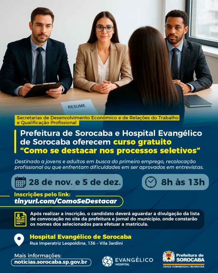 A Prefeitura de Sorocaba, por meio das secretarias de Desenvolvimento Econômico (Sede) e de Relações do Trabalho e Qualificação Profissional (Sert), segue com inscrições abertas para o curso gratuito de “Como se destacar nos processos seletivos”, realizado em parceria com o Hospital Evangélico de Sorocaba. A capacitação é voltada à qualificação de jovens e adultos que desejam aprimorar suas habilidades e aumentar suas chances de sucesso no mercado de trabalho.