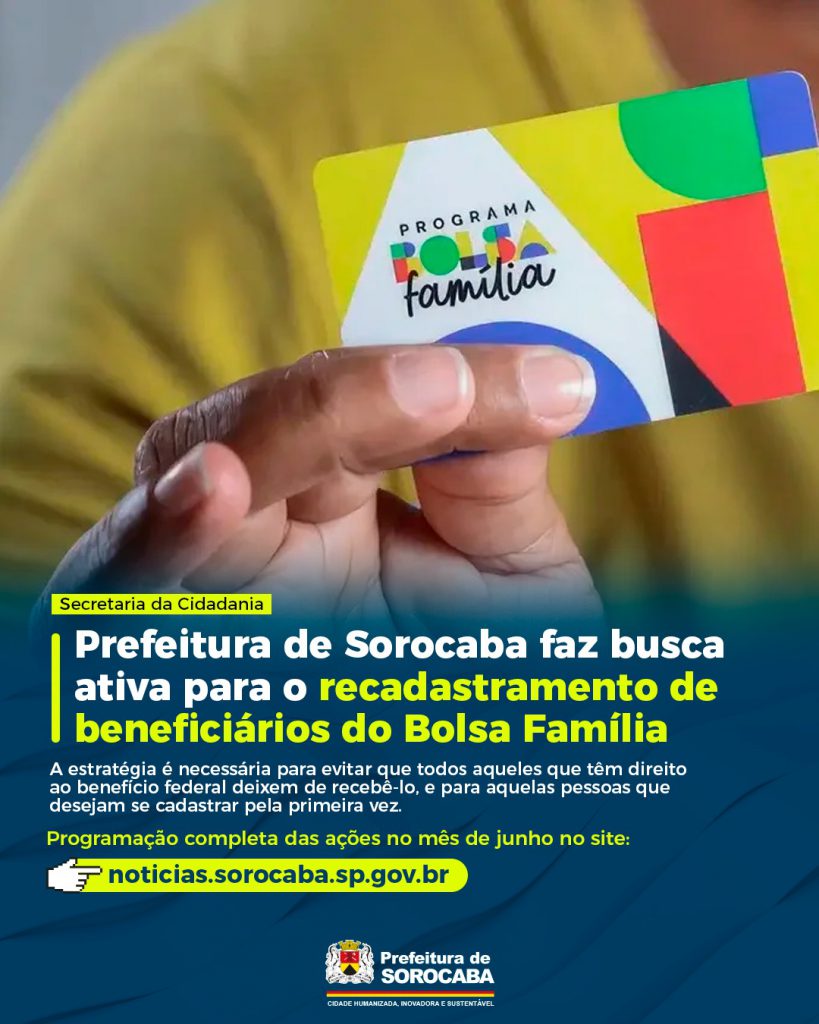 A Prefeitura de Sorocaba, por meio da Secretaria da Cidadania (Secid), realizará no mês de junho, uma série de ações de busca ativa para o recadastramento de beneficiários do programa federal Bolsa Família.