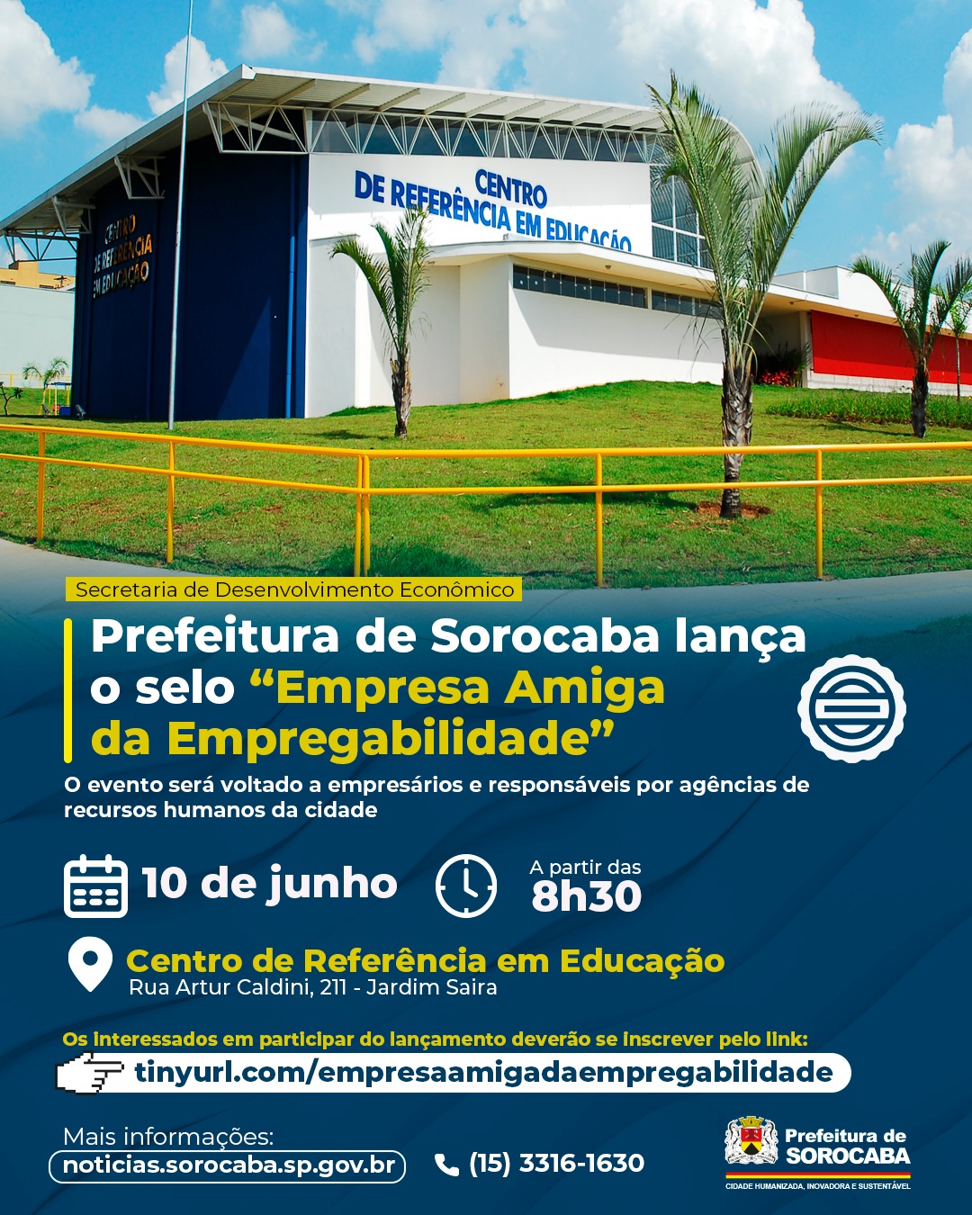 A Prefeitura de Sorocaba, por meio da Secretaria de Desenvolvimento Econômico (Sede), lançará, no dia 10 de junho, a partir das 8h30, o selo “Empresa Amiga da Empregabilidade”, no Centro de Referência em Educação (CRE), localizado no Jardim Saira. O evento será voltado a empresários e responsáveis por agências de Recursos Humanos (RH) da cidade.