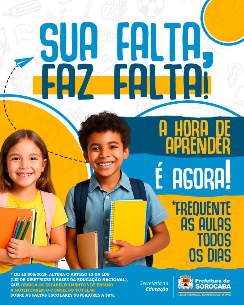 Com o lema “Sua falta, faz falta – A hora de aprender é agora!”, a campanha, que será veiculada nos canais oficiais da Prefeitura, em próprios municipais e com o apoio da imprensa, faz um alerta à população sobre esse importante aspecto do processo de aprendizagem e esclarece que, segundo a Lei 13.803/2019, que altera o artigo 12 da LDB (Lei de Diretrizes e Bases da Educação Nacional), tornou-se obrigatória a notificação ao Conselho Tutelar, pelos estabelecimentos de ensino, sobre faltas escolares superiores a 30%.