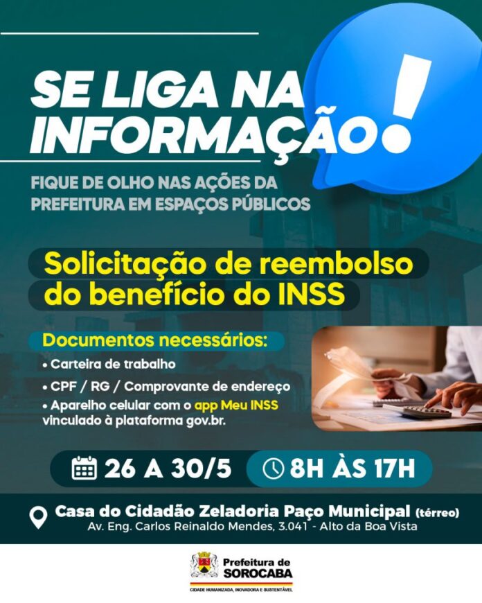 A Prefeitura de Sorocaba, por meio das secretarias de Governo (Segov), da Cidadania (Secid) e da Fazenda (Sefaz), atenderá, até esta sexta-feira (30), das 8h às 17h, na Casa do Cidadão Zeladoria do Paço Municipal, localizada no Alto da Boa Vista, os aposentados que precisam solicitar o reembolso do benefício do INSS.