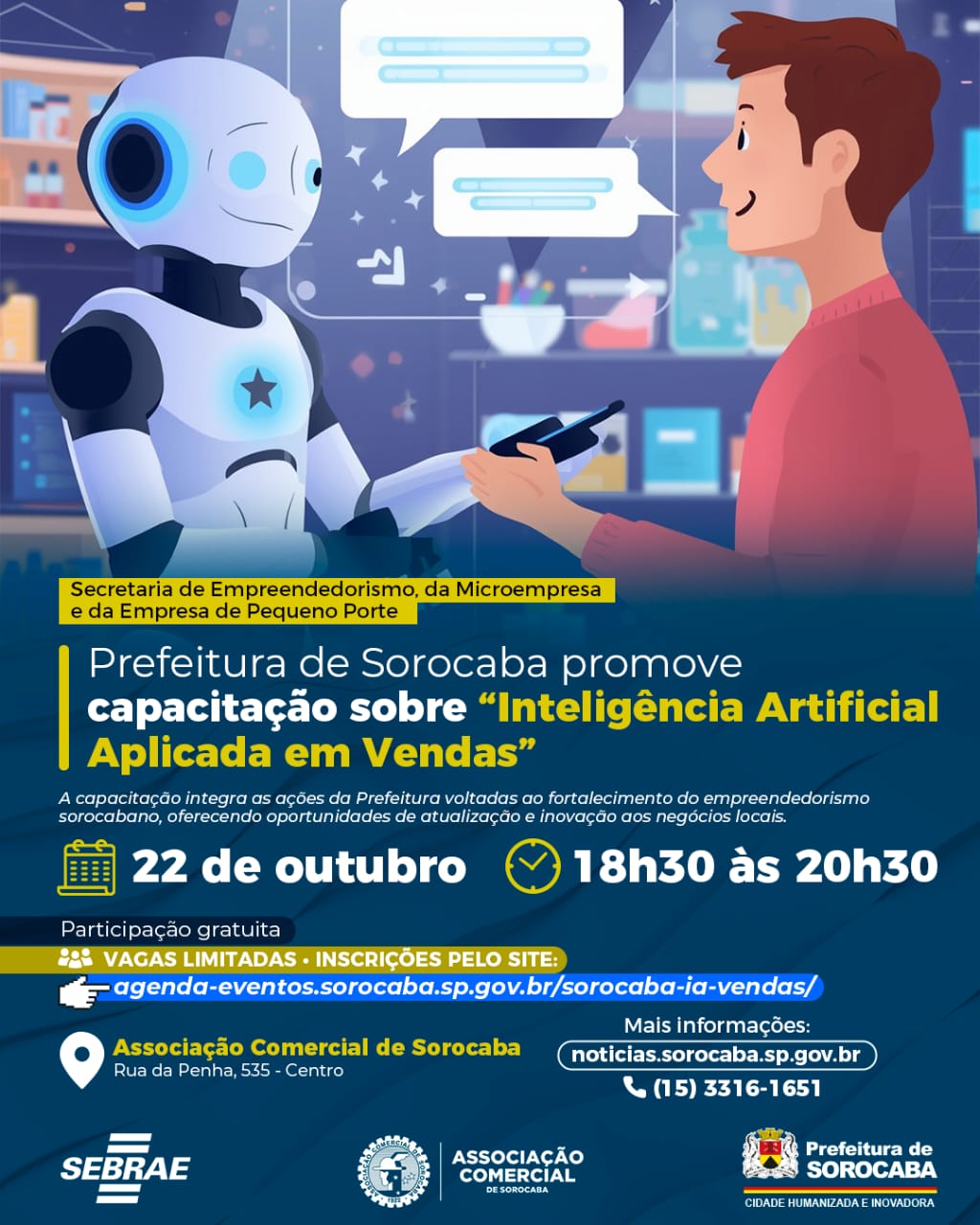 A Prefeitura de Sorocaba, por meio da Secretaria de Empreendedorismo, da Microempresa e da Empresa de Pequeno Porte (Semepp), em parceria com o Serviço Brasileiro de Apoio às Micro e Pequenas Empresas (Sebrae) e a Associação Comercial de Sorocaba (ACSO), promovem, no dia 22 de outubro (quarta-feira), das 18h30 às 20h30, a capacitação com o tema “Inteligência Artificial Aplicada em Vendas”.