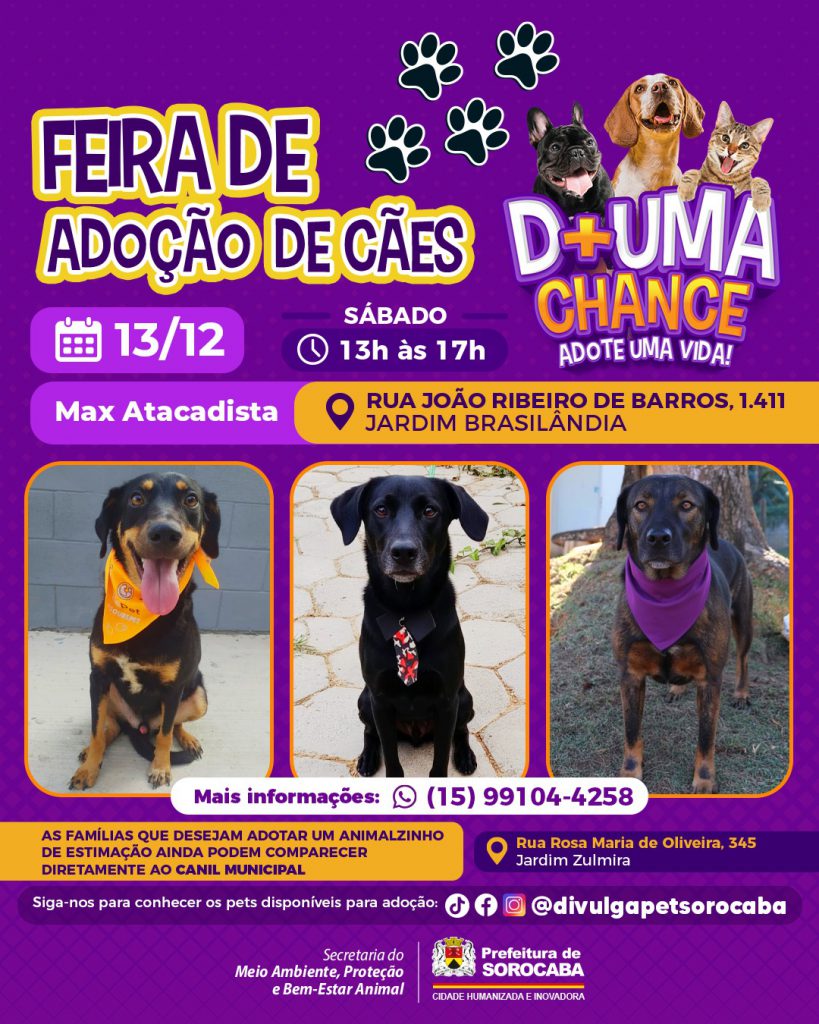 Quem se interessar em adotar um animalzinho também pode comparecer no Canil Municipal, de segunda a sexta, das 9h às 16h, na Rua Rosa Maria de Oliveira, 345, ao lado do Instituto Humberto de Campos, no Jardim Zulmira. Mais informações pelo telefone: (15) 3202-8006 e pelo WhatsApp: (15) 99104-4258. Os munícipes também podem conhecer animais disponíveis para adoção na rede social da campanha Divulga Pet: @divulgapetsorocaba.