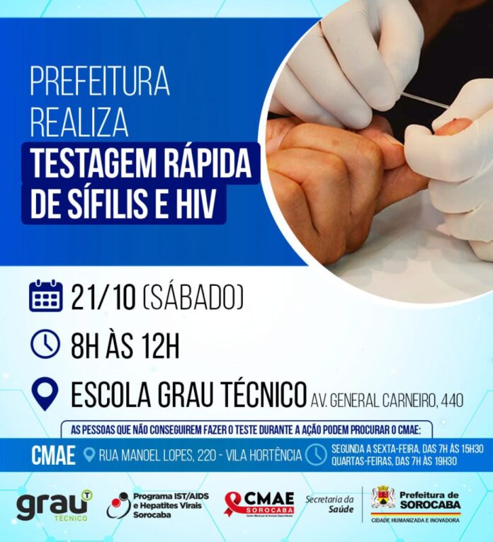 Com o objetivo de prevenir e combater as ISTs (Infecções Sexualmente Transmissíveis), a Prefeitura de Sorocaba, por meio do Programa Municipal de IST/AIDS/Hepatites Virais e o Centro Municipal de Atenção Especializada (CMAE), da Secretaria da Saúde (SES), realizará, neste sábado (21), das 8h às 12h, ação de testagem rápida de HIV e Sífilis na Escola Grau Técnico, localizada na Av. General Carneiro, 440, na Zona Oeste da cidade.
