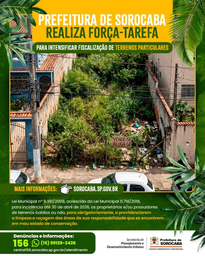 A Prefeitura de Sorocaba, por meio das secretarias de Planejamento e Desenvolvimento Urbano (Seplan), inicia uma força-tarefa, a partir desta sexta-feira (6), para intensificar a fiscalizações em terrenos particulares com mato alto e entulho. A ação é uma medida preventiva, sobretudo, para erradicar possíveis criadouros de Aedes aegypti e animais peçonhentos, regida por nova regulamentação.