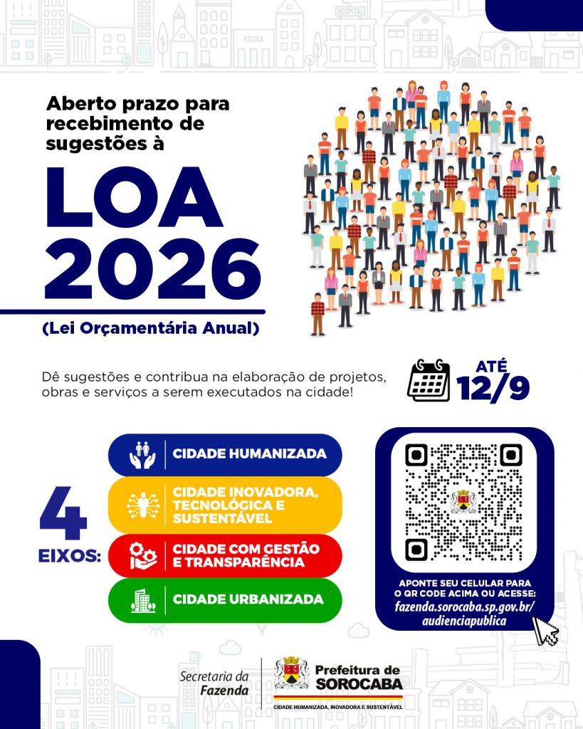 A população de Sorocaba já pode participar da elaboração da Lei Orçamentária Anual (LOA) de 2026. A Prefeitura, por meio da Secretaria da Fazenda (Sefaz), abriu nesta quarta-feira (13) o prazo para o envio de sugestões on-line, que segue até a meia-noite do dia 12 de setembro.